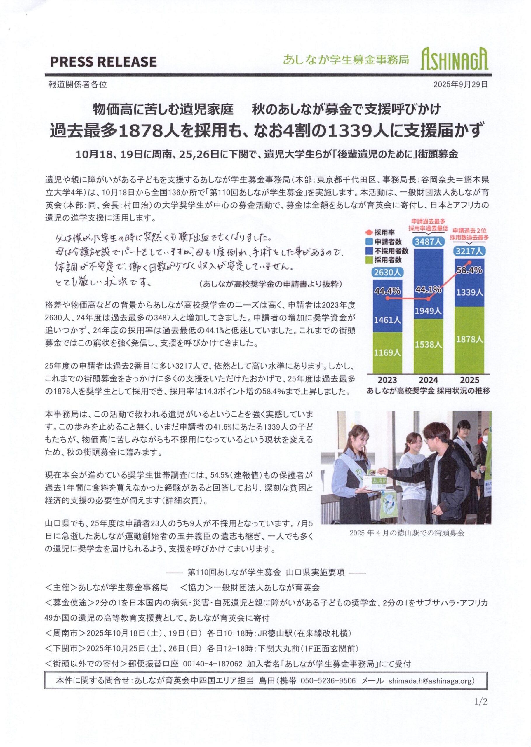 あしなが学生募金「徳山駅で募金します!」10/18、10/19