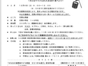 学校や家庭以外に子ども達の居場所を作ろうと、平成24年度から「はなおか放課後子ども教室」が始まりました。今年度、4回目の教室として「もちつき&遊び」を開催します。