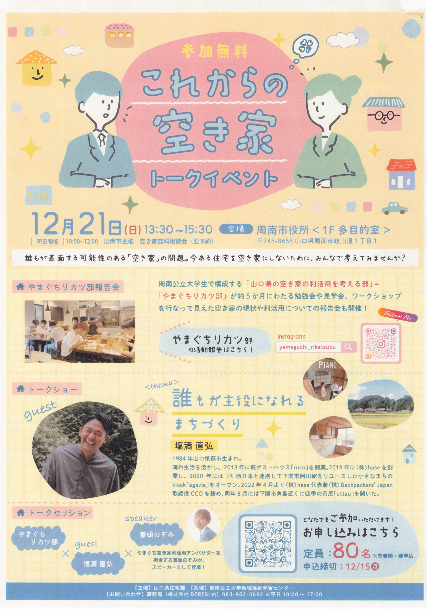 周南市内に「空き家をお持ちの方」や「将来空き家になる可能性のある家をお持ちの方」を対象とした、空き家無料相談会を実施します。山口県内各地で開催される相談会の一つで、司法書士・宅地建物取引士が相続・売却・解体・家財整理等の相談に応じます。(要予約)