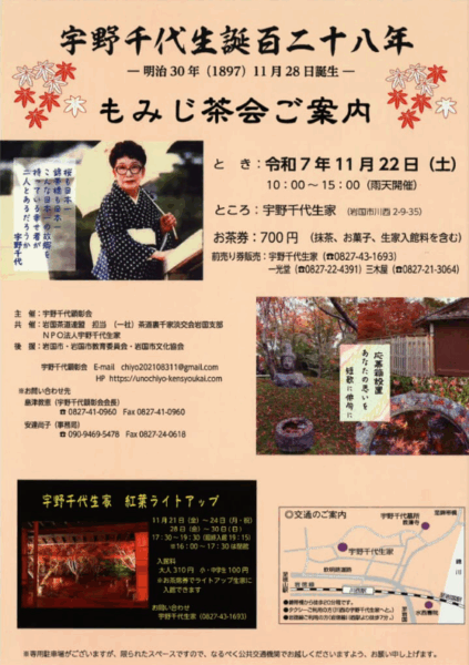 日本を代表する女流作家、宇野千代の誕生日にあわせて「もみじ茶会」が開催されます。