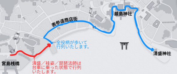 開催場所:平清盛像前(宮島桟橋前広場)~表参道商店街~御笠浜~嚴島神社~清盛神社
