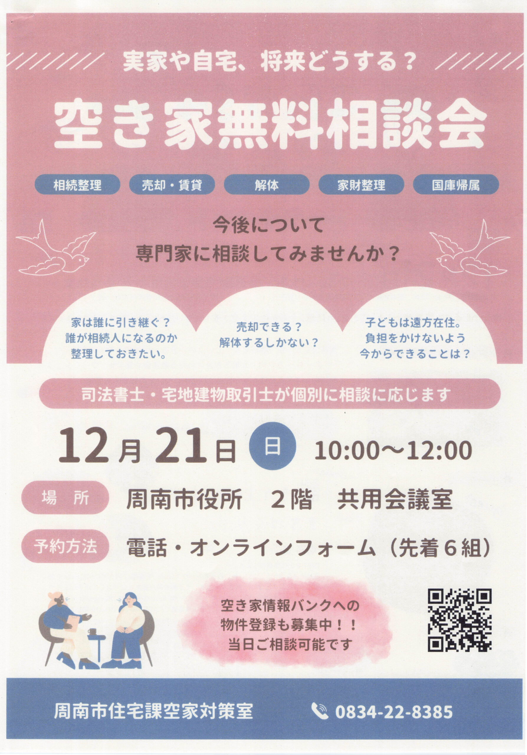 周南市内に「空き家をお持ちの方」や「将来空き家になる可能性のある家をお持ちの方」を対象とした、空き家無料相談会を実施します。山口県内各地で開催される相談会の一つで、司法書士・宅地建物取引士が相続・売却・解体・家財整理等の相談に応じます。(要予約)