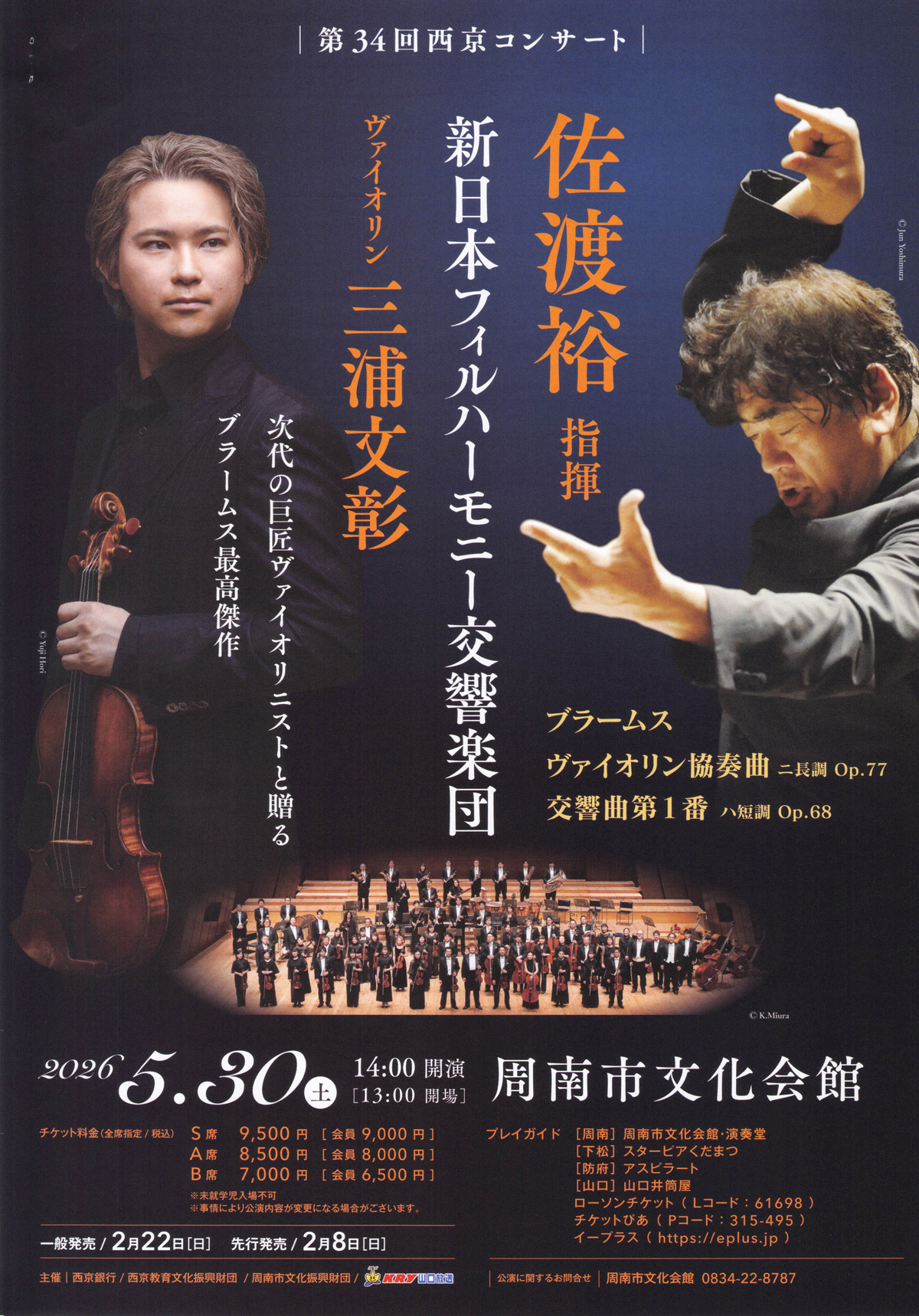 佐渡裕指揮のもと、新日本フィルハーモニー交響楽団とソリスト三浦文彰がブラームスのヴァイオリン協奏曲を、そして新日本フィルが交響曲第1番を演奏します。