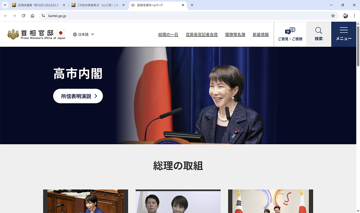 「本日、私は内閣総理大臣を拝命し、新たな内閣が発足いたしました。日本と日本人の底力を信じてやまない者として、日本の未来を切り拓く責任を果たすべく、全身全霊を捧げてまいります。